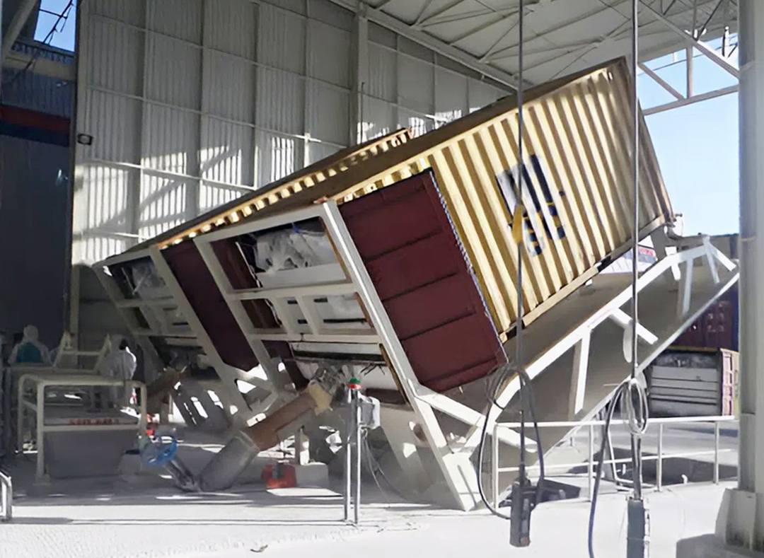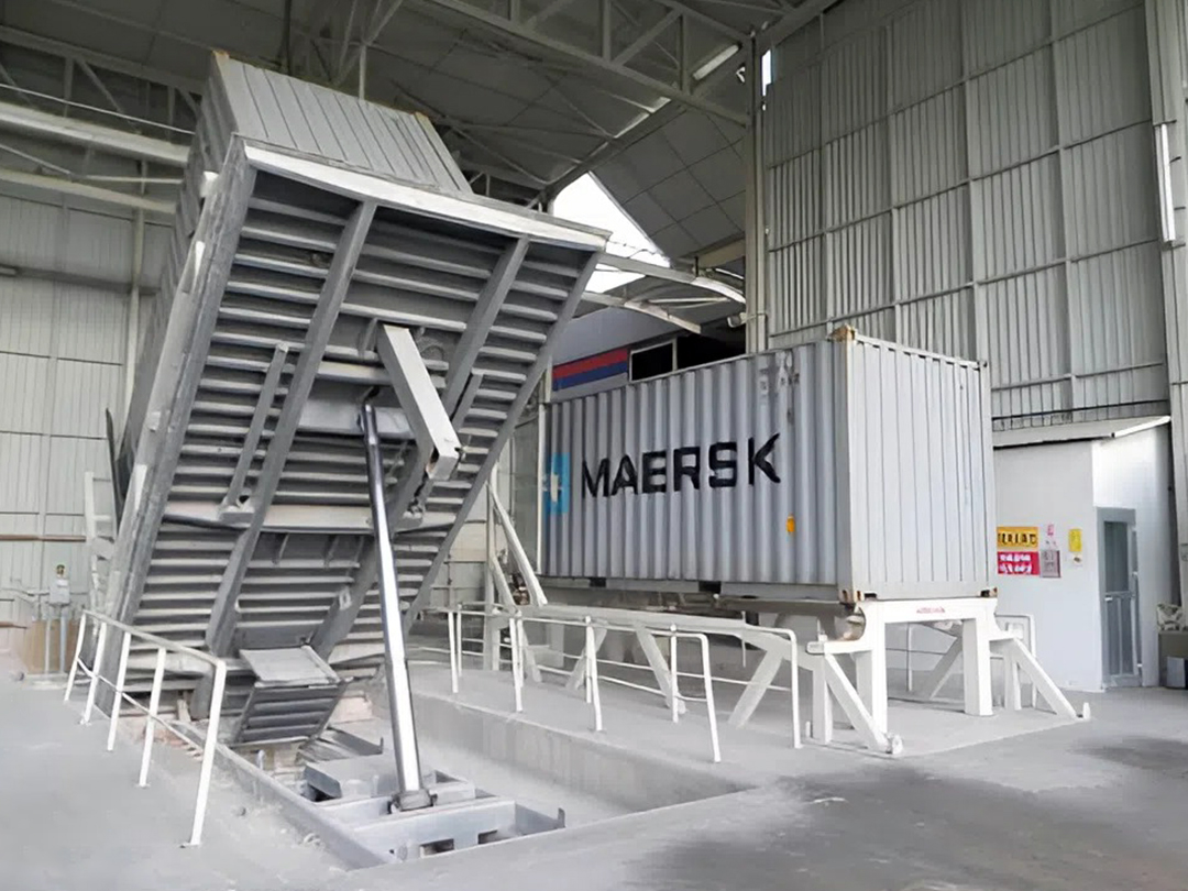Установка контейнера на платформу выполняется с помощью крана. Конструкция имеет разъемные соединения, что позволяет модернизировать или адаптировать разгрузчик в будущем. Поскольку оборудование монтируется в бетонном канале, техническое обслуживание значительно упрощается.